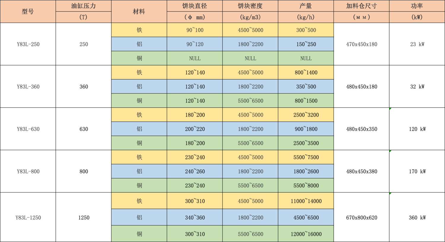 Y83系列立式金屬屑餅機(jī) Y83系列金屬屑壓塊機(jī)(屑餅機(jī)),適用于鋁合金型材廠、鑄鋼廠、鑄鋁廠、鑄銅廠,將各種金屬屑(鐵屑、銅屑、不銹鋼屑、鋁屑等)、粉粒狀金屬粉(鐵粉、鋁粉、銅粉、鉛粉等)壓塊回爐,替代廢鋼、生鐵、鋁錠、廢銅作原材料,可減少燒損。該設(shè)備能將粉粒狀的鑄鐵屑、鋼屑、銅屑、鋁屑等直接冷壓成3~6公斤的圓柱餅塊,以便于運(yùn)輸、投爐、整個(gè)過程不需加溫、添加劑,或其他工藝。鑄鐵屑壓制后密度可達(dá)5~6T/m3。該產(chǎn)品還可根據(jù)客戶要求,采用國產(chǎn)或進(jìn)口液壓、電氣元件,配自動(dòng)加料、稱重等裝置。 Y83系列金屬屑壓塊機(jī)以“科技以人為本”的設(shè)計(jì)理念,真正意義上實(shí)現(xiàn)了高性能高產(chǎn)量、低故障率、低能耗、整機(jī)一人操作,是目前最先進(jìn)的金屬屑壓塊機(jī)。 產(chǎn)品特點(diǎn) 1、本機(jī)采用液壓傳動(dòng),高度集成閥塊,超大流量通徑,使系統(tǒng)壓力損失少,密封性能好。 2、插裝閥、電液比例閥的使用和獨(dú)特的油路設(shè)計(jì)使液壓系統(tǒng)完美無缺,即使在長期大負(fù)荷的情況下工作,系統(tǒng)也不會(huì)出現(xiàn)力不從心的現(xiàn)象。 3、系統(tǒng)設(shè)計(jì)預(yù)泄荷裝置,徹底消除了液壓沖擊。 4、先進(jìn)的快速裝置,確保您的班產(chǎn)量。 5、電器部分采用進(jìn)口PLC全自動(dòng)控制系統(tǒng),抗干擾能力強(qiáng)、故障率低。 技術(shù)參數(shù) 圖片展示 工作視頻 客戶現(xiàn)場